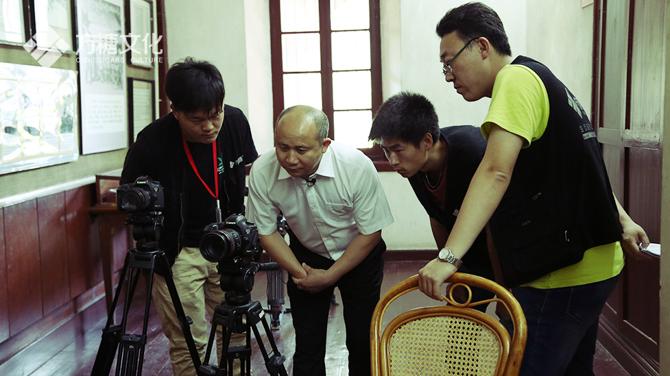 等館長來的時候,我們已經調整好機位,對好焦距。拍攝前編導和館長進行了一些細節上的溝通,攝影師把館長的領口和袖口理順,裝好麥克風,一切萬事俱備。