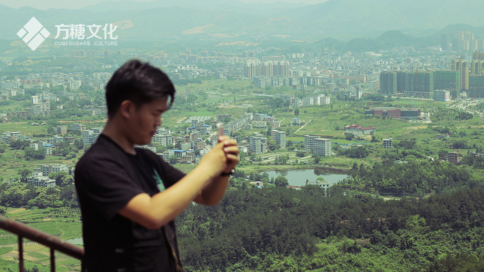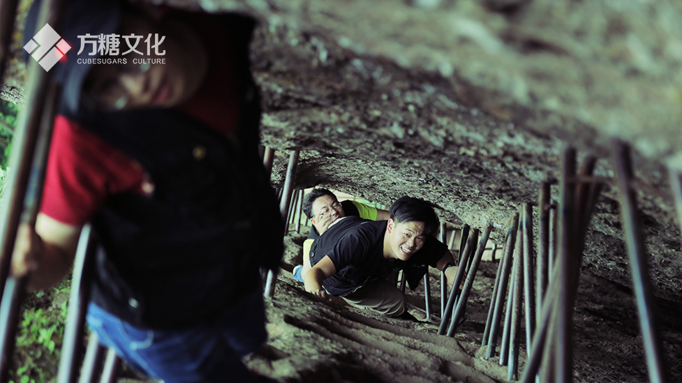 還好,當天游人極少,大家互相打趣、嘻哈著一鼓作氣攀登了上去。其實不想一鼓作氣也不行,因為中途根本沒有可以歇息的地方,一旦一個人停下,就會影響別人的上下攀爬。真不敢想象在游人眾多的時節,上、下行的兩股人流是如何穿行在這條狹小的石縫中呢?登上頂峰,果然有一覽眾山小的感覺,豪氣沖天!遠處的城市盡收眼底,攝影師興奮地拿起無人機開始拍攝,大家都不亦樂乎的互相拍照留念,讓我們有點感到小意外的是發現了一塊牌子,上面寫著“微信掃一掃,查看您的登頂證書及排名”,還可以這樣玩呢?峰頂確實艷陽高照,在樹蔭下都汗流不止,停留一會兒后,我們便決定下山,沒想到下去比上來更加吃力,因為想多拍些鏡頭,上山時我們帶著無人機等設備,下山時這些設備就成了累贅,小編一手端著相機,僅靠一只手和雙條腿受力,戰戰兢兢地一步一步往下爬,落到地面后,雙腿還是顫顫巍巍……