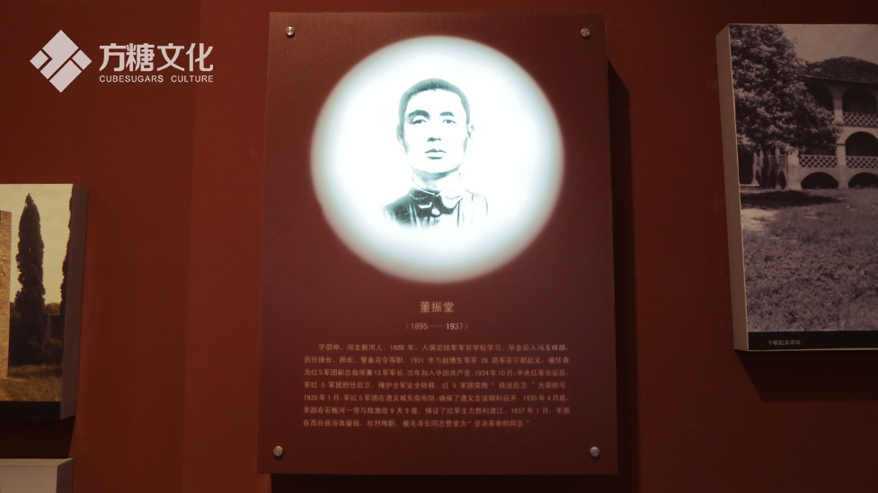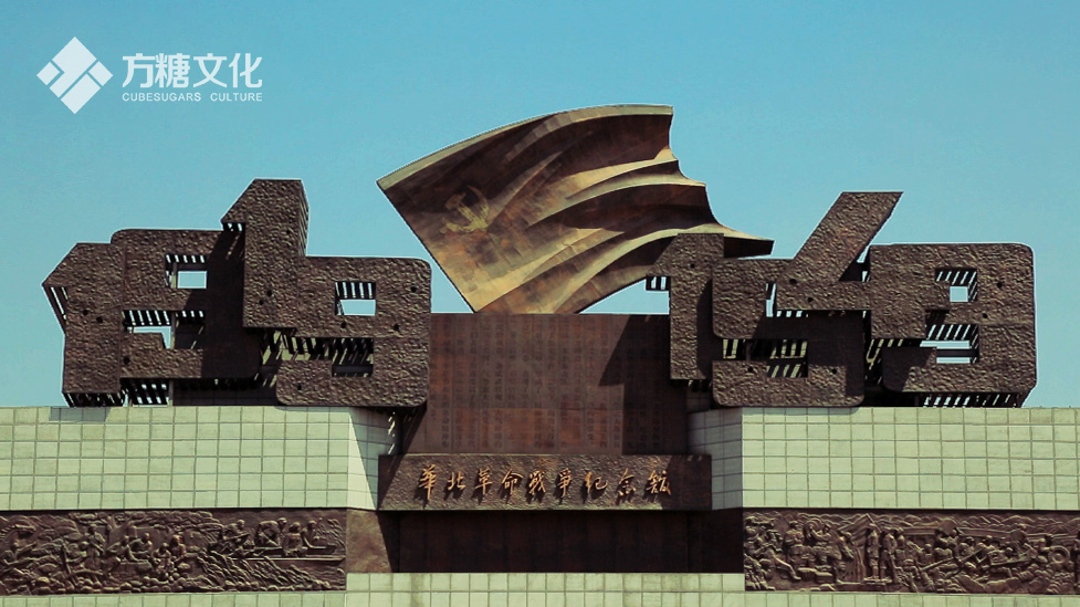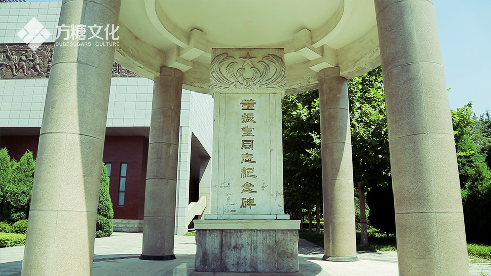 我們順著路標,來到董振堂、趙博生烈士紀念碑亭,兩座紀念碑亭佇立在華北革命戰爭紀念館的兩側,左右護航。幾組鏡頭過后,另一隊攝制組從烈士墓區也趕到紀念館門口。我們匯合完畢,開始館內拍攝。