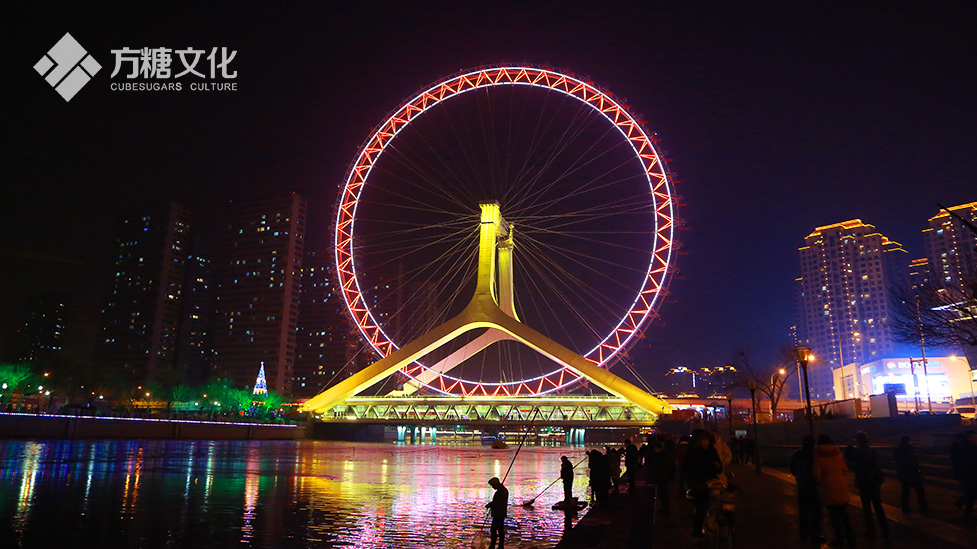 巨大的摩天輪聳立在橋上,在黑夜的襯托下,配著海河泛起漣漪的波紋,顯得十分的絢麗夢幻、美輪美奐。