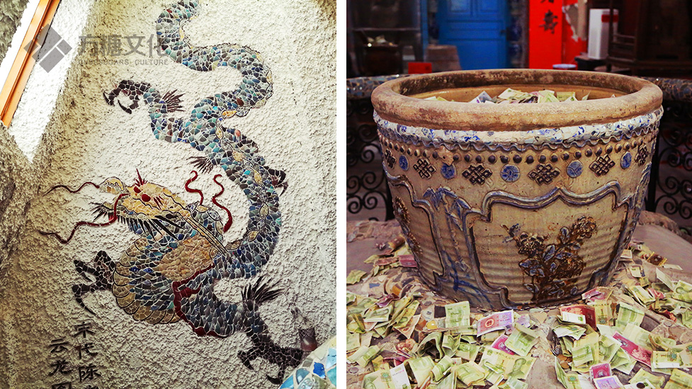 瓷房子上鑲嵌的7億多塊瓷片涵蓋了各個歷史時期,有晉代青瓷,唐三彩,宋代鈞瓷、龍泉瓷,元明青花,清代紛彩等,幾乎官窯、民窯的所有門類都可以在墻上找到,而且都用水泥內部澆注,并用大理石膠粘連固定,成為建筑的一部分。